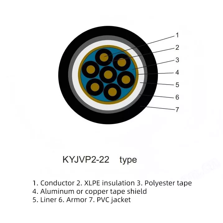 Quando você está procurando um cabo com proteção máxima para sistemas de controle críticos sob forte interferência eletromagnética, altos riscos mecânicos e ambientes complexos (como enterramento direto e umidade), o durável cabo de controle STA blindado com trança de cobre revestido de PVC isolado em XLPE da Yilan Cable, modelo KYJVP-222, como um dos principais fabricantes na China, atende a esses requisitos. Ele combina os três principais desempenhos de blindagem trançada de fio de cobre de camada dupla (P2), armadura de fita de aço (22) e resistência à temperatura de 90°C (YJ), projetada para garantir a pureza absoluta dos sinais e a segurança absoluta das conexões físicas sob as condições mais severas.